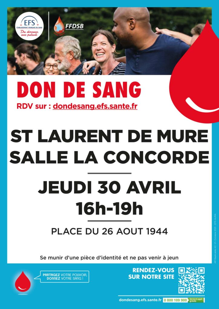 Pour prendre rendez-vous : https://dondesang.efs.sante.fr/trouver-une-collecte/155639/tous?ville=ST%20LAURENT%20DE%20MURE